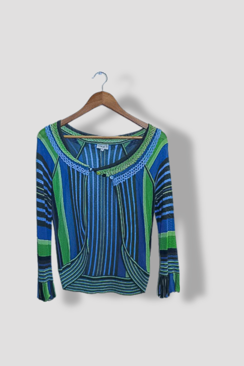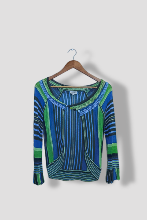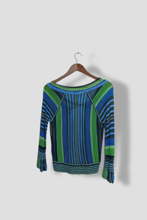 Vintage Karen Millen Women's Green Blue Striped Viscose Medium Blouse -